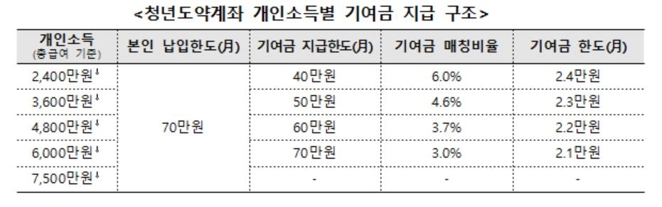 정부가 청년도약통장에 추가하는 보조금(기여금)은 개인소득과 본인 납입 금액에 따라 차등지급한다. 개인소득이 낮을수록 지원이 많이 이뤄졌습니다. 또 총급여가 4800만 원 미만이면 70만 원(월 40만~60만 원) 미만이라도 정부 보조금을 모두 받을 수 있도록 보조금 지급 한도를 별도로 설정했습니다.
