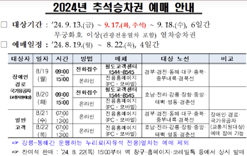 9월 13일 ~ 18일 까지 6일 동안 운행하는 운행하는 KTX와ITX 등 승차권 사전 예매가 8월 19일 월요일 부터 목요일까지 단 4일 동안 진행된다고 합니다.